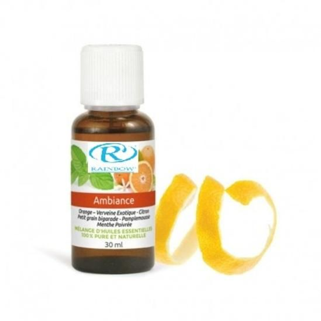 Le mélange d'huiles essentielles AMBIANCE vous plonge dans une ambiance chaude et conviviale grâce à sa composition : Huiles essentielles d'orange, de citron, de verveine exotique, petit grain bigarade, de pamplemousse et de menthe poivrée.